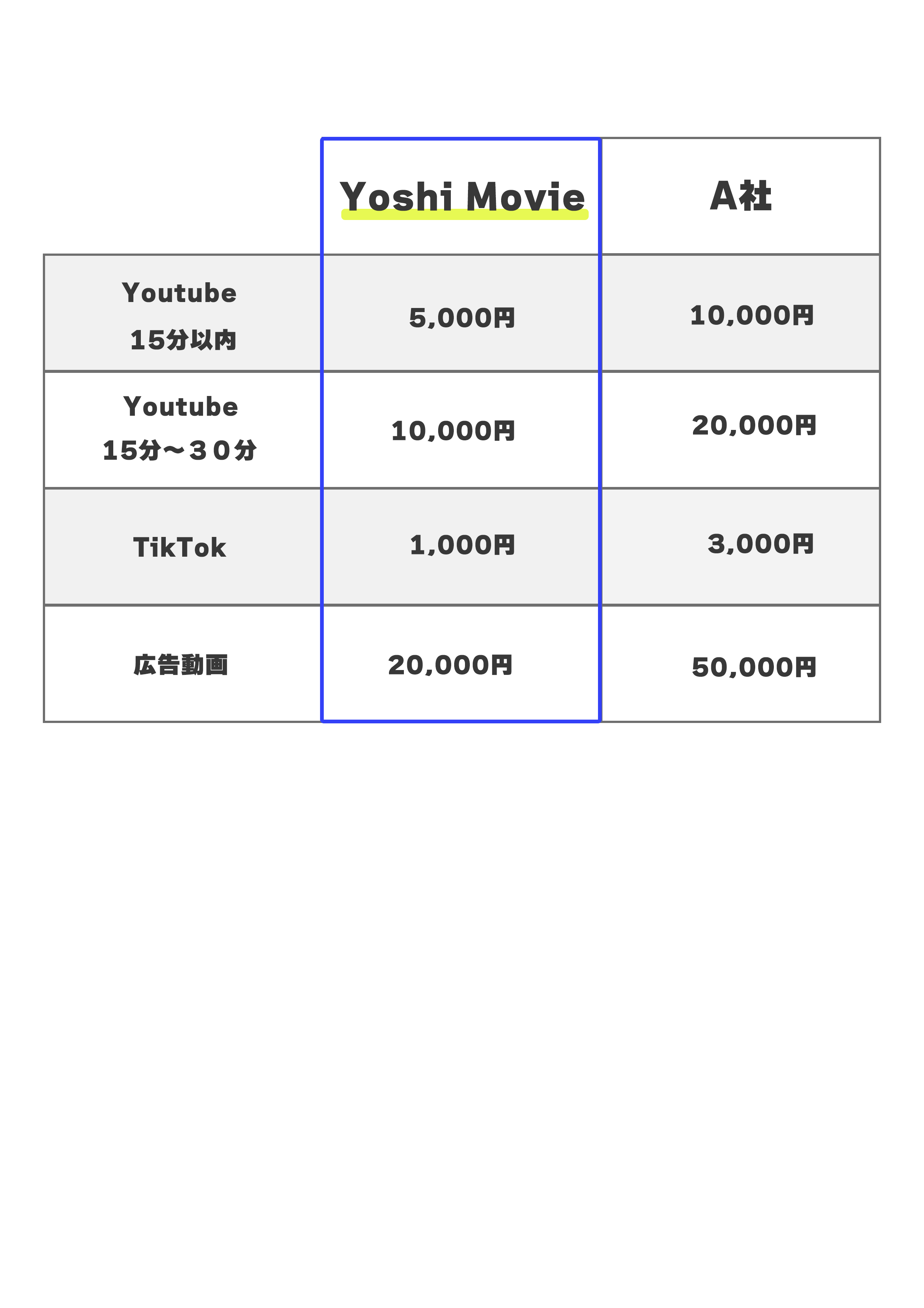 Yoshi Movieの編集は、業界最安値に挑戦しています。